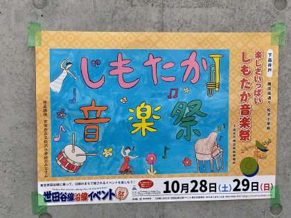 10/28(土)と明日10/29(日)の2日間、松沢小学校正門前と松沢小体育館で下高井戸商店街主催の『しもたか音楽祭』が開催されます。