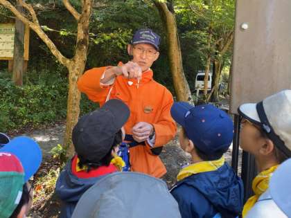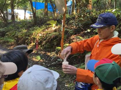 森林観察の時間です。五感を働かせながら、様々な植物を触ったり、においを嗅いたりしました。歩道と林道を約1.5メートル、コースを一周しました。