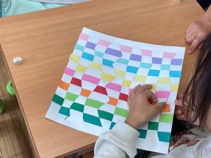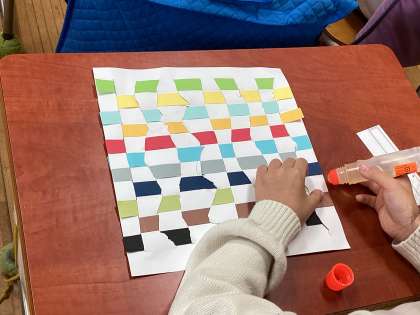 切り込みを入れたところに、細長い色画用紙を上・下と交互に通していくと。