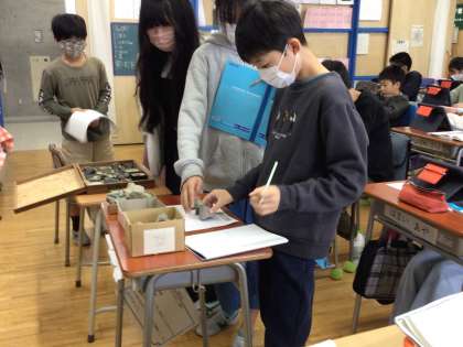 地層に含まれている、化石や岩石について標本を興味深く調べています。