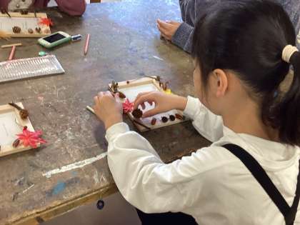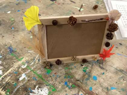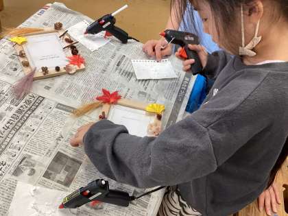 木の実や葉、飾りなどの秋らしい材料を写真立ての周りにデコレートし貼り付け、オリジナル写真立てを作りました。グルーガンを使うときには、角度やバランスを考えて、緊張した面持ちで材料を貼り付けていました。