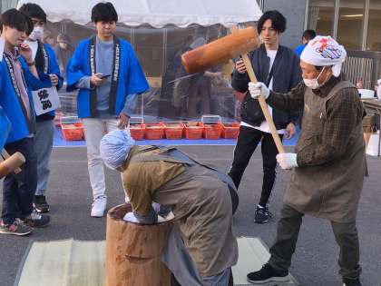 松沢小の正門前で、日大通り商店街3ブロック主催のもちつき大会が行われました。