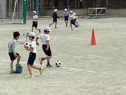 低学年では、的やゴールに向かってボールを投げたり、蹴ったりするゲームを行います。