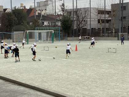 設定したゴール(ハードルを使った小さいゴール)めがけて、ボールを蹴る練習をしました。