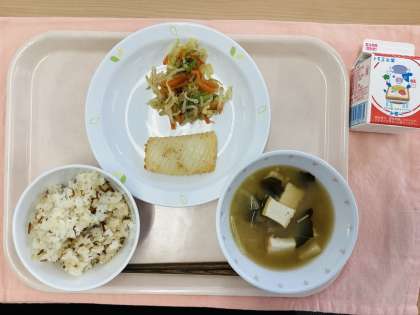 今日の給食には、じゃこ、いか、野菜をたっぷり使って、