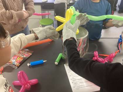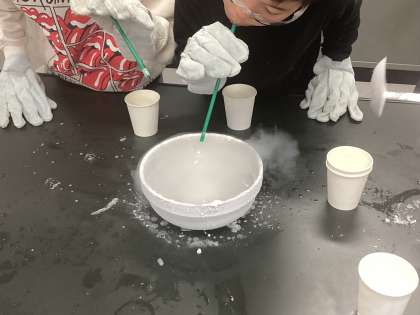 今日は科学クラブにとって特別なクラブです。日大理学部の学生さんたちが液体窒素を使った科学実験を準備してくださいました。「液体窒素で凍らしたバナナでクギは打てるのか」「穴を空けたピンポン球を液体窒素で凍らすとどうなるか」いくつものコーナーを交代制で体験することができました。