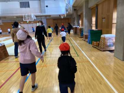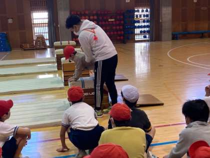 パオパオ出前授業がありました。ウォーミングアップでマットの周りをスキップしたり、くまさん歩きをしたりした後、マットの柔軟運動をしました。
