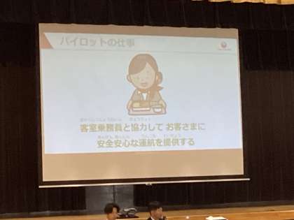 今年度6年生「未来への航海」第2弾です。」JAL(株)から新城さんと宇都宮さんをお迎えして、パイロットの仕事についての話をしていただきました。