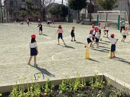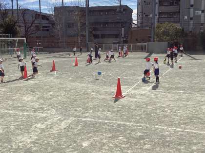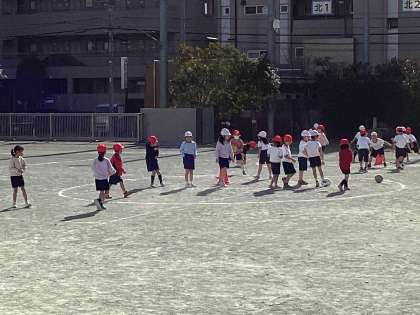 校庭では1年生の3クラスがボールけりゲームに取り組んでいました。