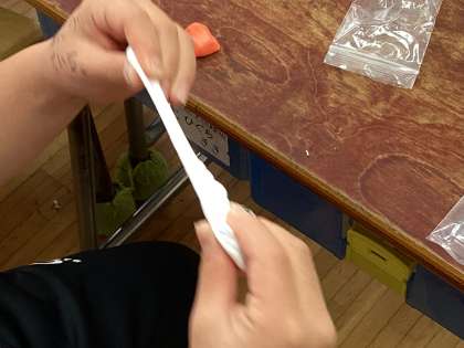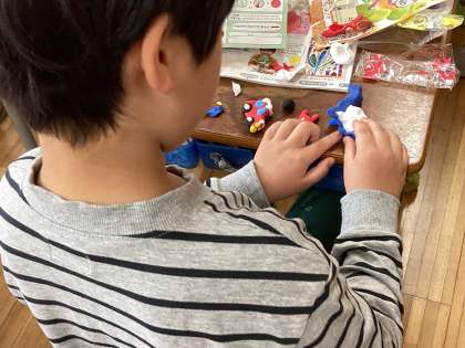 マグネットにしたい物を自分で考え、紙粘土で作っていきます。動物、食べ物、乗り物、キャラクターなどなど、色鮮やかなマスコットが出来上がってきました。マグネットをつければ完成です。
