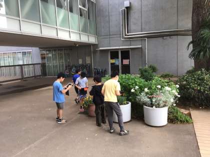 青色の花・ギザギザの葉・飛んでいる生き物など、お題に合わせた自然をたくさん見つけることに親しみました。