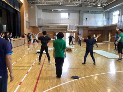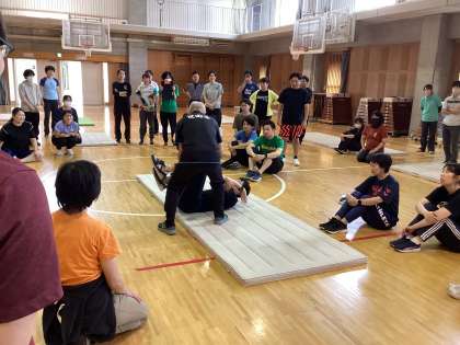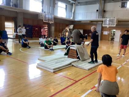 今年度の校内研究は、体育について学んでいきます。今日は準備運動や体つくり運動のポイント、マットの主運動につながる動きや台上前転・頭跳ね飛びのコツ、児童間でアドバイスをし合う活動の進め方などについて学びました。自ら体験しながら、指導するうえで重要なことをわかりやすく学ぶことができました。