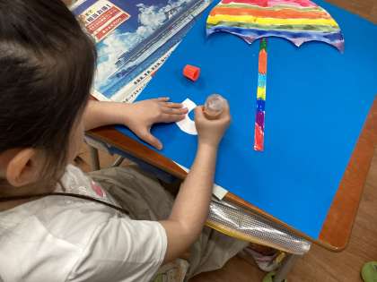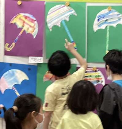 6/6 図工 きはだ学級 公開日 2024/06/06 更新日 2024/06/06 できごと 先週、絵の具で描いたしましま模様の傘に持ち手を付け、台紙に貼って完成させました。鑑賞タイムでは、作品を見合い、いいところ見つけをしました。 いいね(0)