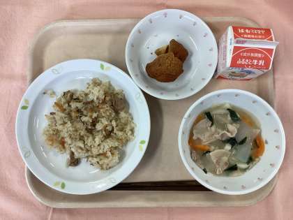 今日は、ご当地給食2日目の沖縄料理です。メニューは、ししじゅうしい・イナムドゥチ・サーターアンダーギーです。「ししじゅうしい」は、豚肉や野菜、刻み昆布を具としてたっぷりの生姜を使った混ぜご飯。「しし」は豚肉、「じゅうしい」は混ぜご飯を意味しています。「イナムドゥチ」は、豚肉を使った甘めのみそ汁です。沖縄の人は豚肉をよく食べます。沖縄県が琉球という国だった時代に、中国との交流の中で豚肉を食べる文化が発達し、今もなお文化として残っているからです。じめっとした暑い季節ですが、豚肉たっぷりの沖縄料理を食べてパワーをつけましょう!