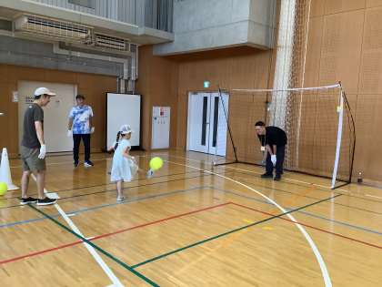 体育館では「体を動かして英語で遊ぼう」「おとなキーパー」「紙ヒコーキ大会」が行われています。