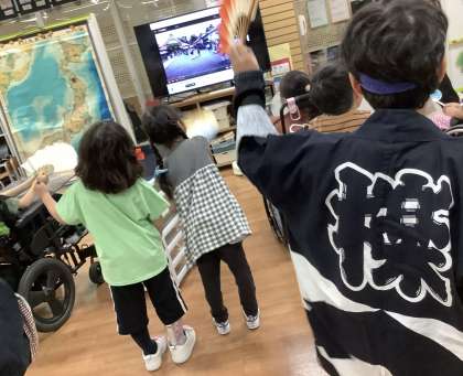 日本各地の有名な踊りを動画で見て、掛け声を掛けながら踊りました。音楽と踊りを楽しみながら、地域によっていろいろな踊りがあることを知りました。