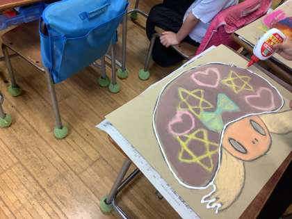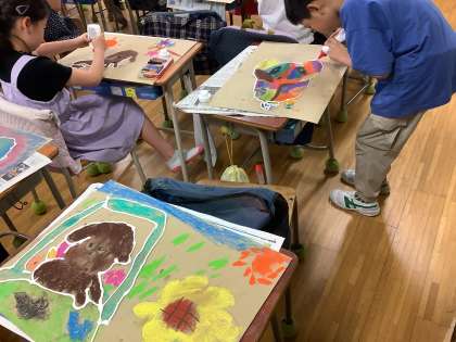 3年生は、ボンドを使った空想の生き物の絵に挑戦しました。ボンドの縁取りは乾くと透明になります。パステルを使って色を塗り、素敵な作品になりました。