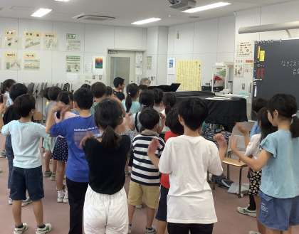 「幸せなら手をたたこう」という歌は明るく元気が出る歌ですね。2年生は振りを付けて元気に歌いました。