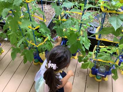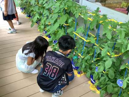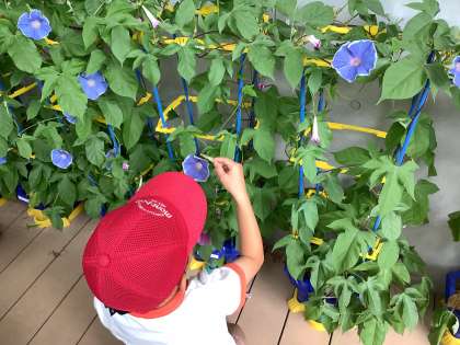 あさがおがとっても大きくなりました。しぼんだお花を摘んで色水を作ります。毎日水をあげるたび、小さな発見があるようです。