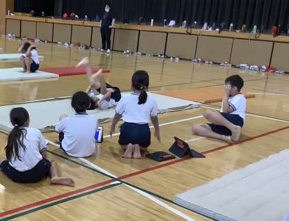 マット運動でいろいろな技に挑戦しました。工夫して技を組み合わせています。