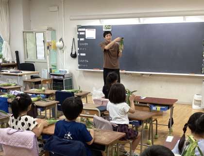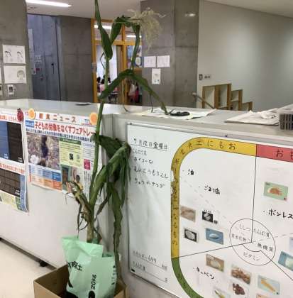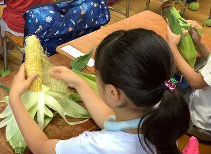 1年生が、とうもろこしの皮剥き体験をしました。剥き終わったとうもろこしは、今日の給食の材料になります。今日の給食が楽しみです。