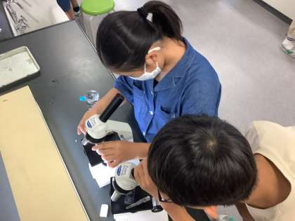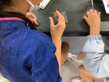 6年生は「植物の体のつくりとはたらき」を学習しています。顕微鏡を使って、葉の裏側の気孔を観察しました。