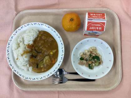 カレーライスと冷凍みかんは、全国の小学校でも人気メニューの一つです。今日は、そのカレーライスに「夏野菜」をたっぷり入れて夏野菜のカレーライスを作りました。なす、ズッキーニ、トマト、とうもろこしの夏野菜を入れているので彩りも鮮やかにできました。