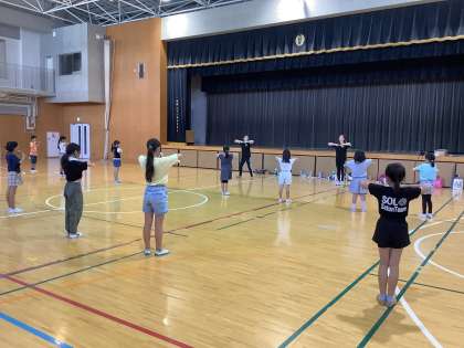 準備運動、柔軟から始まり、ダンスのステップや側転の練習をしてから、いよいよバトンの練習です。
