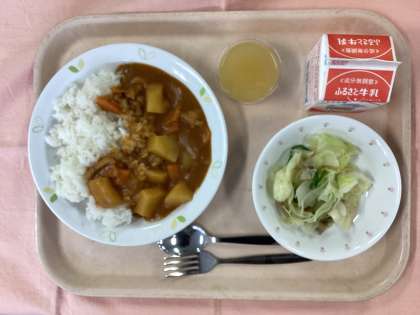 今日は、松沢小学校で子供たちに人気のあるカレーライスです。材料は、鶏肉、人参、玉ねぎ、じゃが芋の具とたくさんのスパイスを使っています。カレー粉とガラムマサラ、ナツメグ、ターメリック、クミンなど、色々な種類のスパイスを組み合わせて作った松沢小学校独自の「美味しい」カレーです。