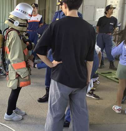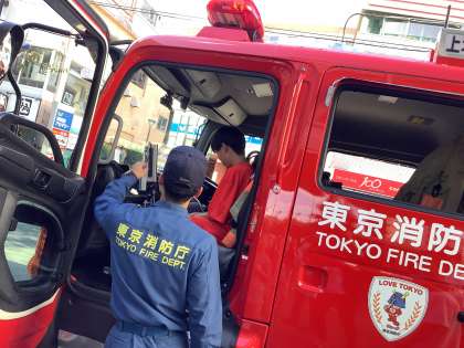 消防車を見学しました。実際に消防士さんの服を着る体験や消防車に乗る体験もしました。何人もの消防士さん達にサポートしてもらいました。