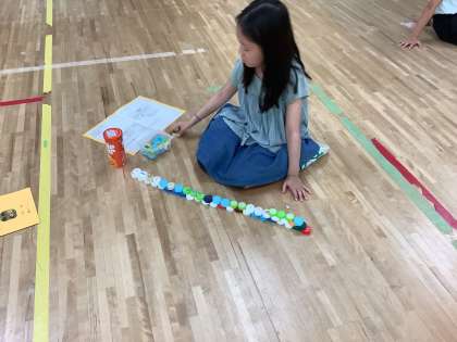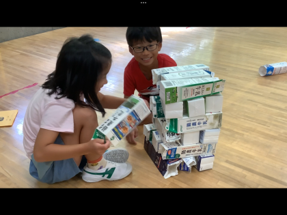 ペットボトルキャップをピラミッドのように積み上げたり、牛乳パックでジェンガをしたり、プリンカップを積み上げて筒を通したり・・・子供の発想は無限です。