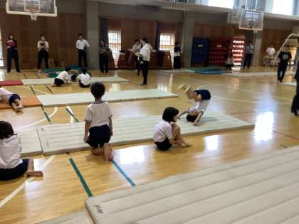 「なりきりお話マットランドへレッツ・ゴー!」と銘打ち、児童が動物をイメージし、前回りや後ろ回り、横転がりや大きな横跳びで表現しながらオリジナルのストーリーを組み立てます。「熊さんが・・・した。」と口にしながら、思い思いの動きをストーリーに組み込もうと、試行錯誤しながら楽しんで運動する様子が見られました。