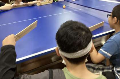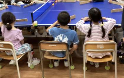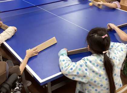 「卓球バレー」という座ったままでできるパラスポーツをしました。本物の卓球台でやるのは初めてでしたが、チームで協力して楽しむことができました。