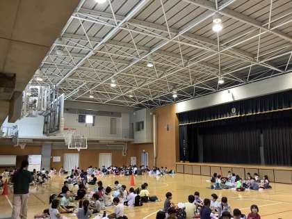 9/27 体育館でお弁当 1年生 公開日 2024/09/28 更新日 2024/09/28 できごと 遠足が延期になり、1年生全員で体育館でレジャーシートを広げてお弁当を食べました。 普段できない体験に子供たちは大盛り上がり!班ごとに集まり友達と楽しく過ごしました。「次は青空の下でお弁当を食べたいね。」と話していました。 いいね(0)