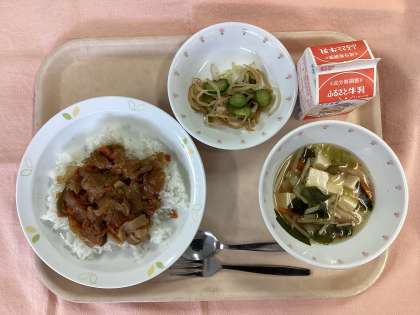 今日は、子どもたちが大好きな豚肉をたっぷり使った「焼肉丼」を作りました。豚肉は、私たちにとって重要なタンパク源です。タンパク質は、筋肉、臓器、皮膚、髪の毛などを作るもとになる栄養素です。不足すると、筋肉が発達せず、体が動きにくくなったり、皮膚や爪もボロボロになってしまいます。また、豚肉にはビタミンB1が豊富に含まれており「疲労回復効果」のある栄養素でもあります。