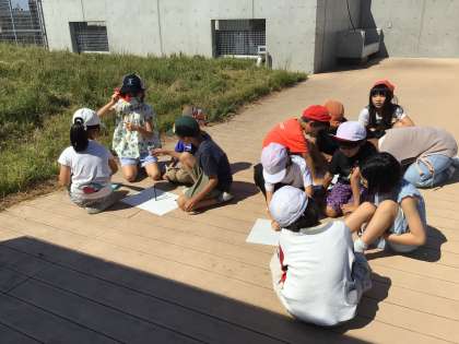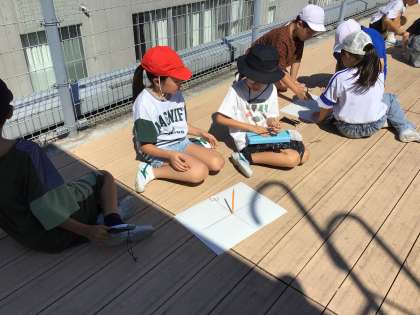 工作用紙に方位を書き、太陽の位置を時刻と比べながら調べました。