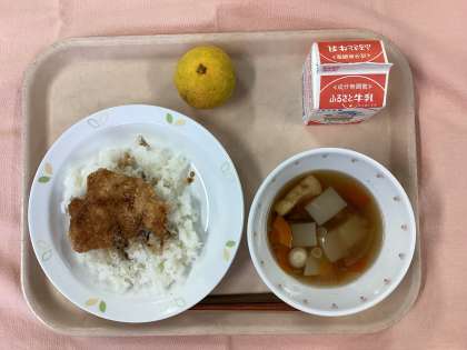 今日の給食は、子供たちに人気のある「タレカツ丼」を作りました。本来の「タレカツ丼」は、薄い豚肉で作りますが、給食では鶏肉を使っています。鶏肉は、食べやすく切らずにごはんの上にのせられる利点があります。とても美味しい本校の自慢メニューです。味付けは、醤油、砂糖、味醂、ウスターソースを煮るだけです。そのタレにカツ(豚カツなら食べやすく切る)をくぐらせてごはんの上にのせて出来上がりです。良かったらご家庭でも作ってみてください!