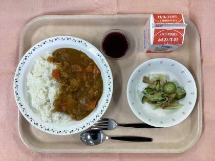 本日から読書週間が始まりました。給食でも読書週間に合わせて7日(月)、11日(金)、17日(木)の3日間は、「ブックメニュー」を出します。初日の今日は、「給食室のいちにち」からです。調理員さんが、朝から働いている様子がよくわかる内容です。絵本の中に出てくるメニューは、カレーライス、サラダ、ゼリーで、今日の給食も真似して作りました。子どもたちが、興味をもって本を読んでくれると嬉しいですね!!