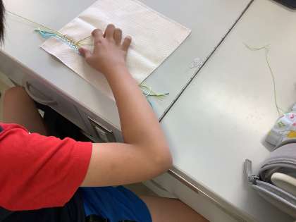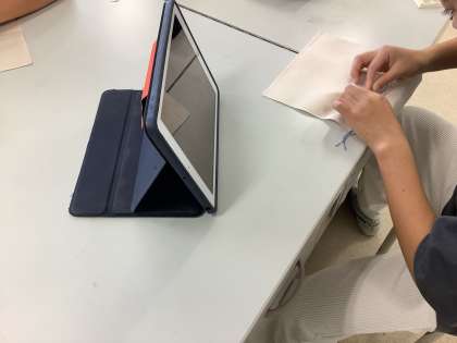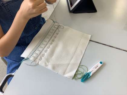 6年生はスウェーデンステッチという刺繍に挑戦しています。タブレットでいろいろなデザインを検索して、自分らしい作品作りに取り組んでいます。