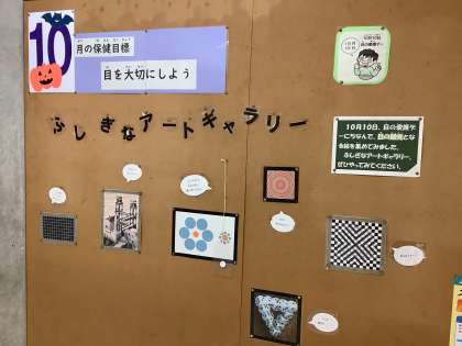 10/10 目の愛護デー 公開日 2024/10/10 更新日 2024/10/10 できごと 今日10月10日は目の愛護デーです。 保健室前には目の錯覚となる絵を集めたアートギャラリーが掲示されています。 おもしろいので、見てみてほしいと思います。 いいね(0)