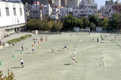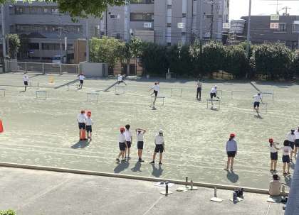6年生は体育でハードル走を練習しています。自分の歩幅にあったハードルを試していました。