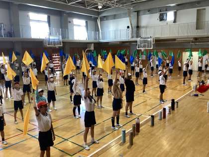 学年での一斉練習が始まりました。クラスで練習した動きを全体で揃えています。なかなか旗の音が揃わないところがありますが一生懸命取り組んでいます。これからの成長が楽しみです。