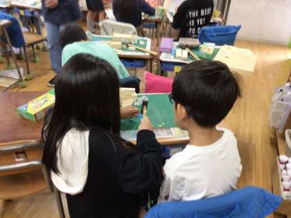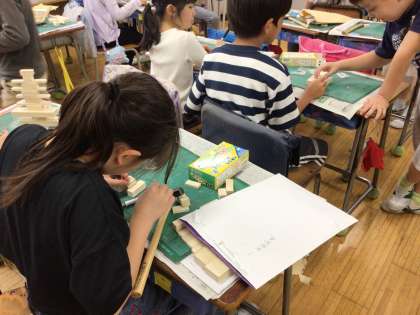 友達を教え合いながら、金づちとクギの使い方を覚えています。様々な形の木材を使って、自分なりの形を作り上げました。