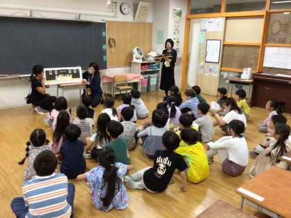 今日の朝の時間は読み聞かせボランティアの方に絵本を読んでもらいました。大きな絵本など特別な絵本で子供たちは夢中になって聞いていました。