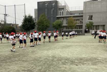 校庭で練習しました。自分の場所を確認して踊りました。