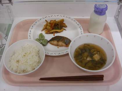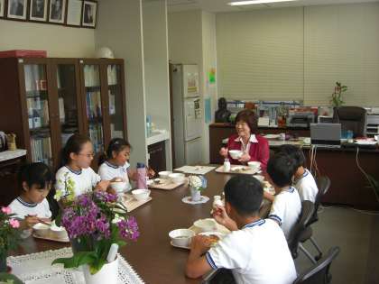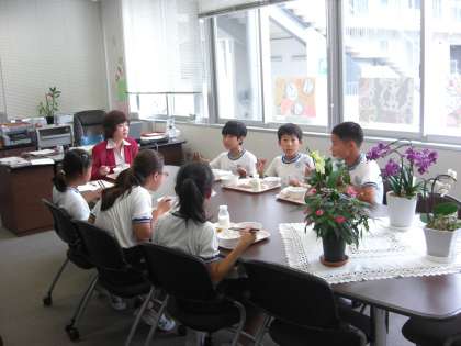 校長先生と一緒に給食をいただきます。