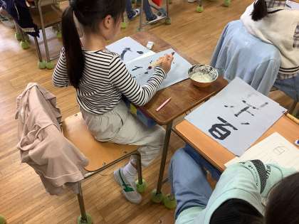 10/31 水書 3年生 公開日 2024/10/31 更新日 2024/10/31 できごと 水書で筆の使い方を練習しました。水書(すいしょ)は、墨ではなく、筆に水を染み込ませて書くので、紙が乾けば何度もやり直しができます。専用の水筆紙をつかいます。 いいね(0)