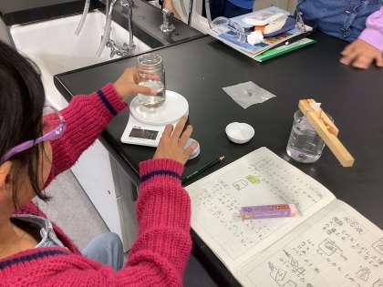 食塩を水に溶かした時の水の重さについて調べる実験を行いました。
