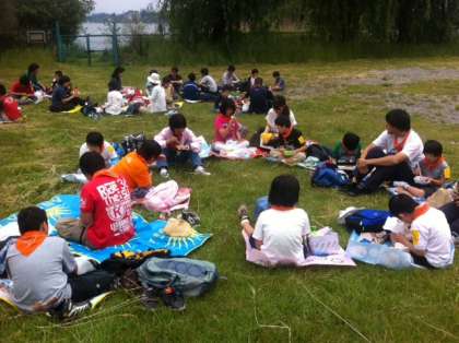 初日は湖畔でお弁当を食べました。