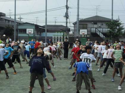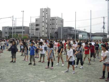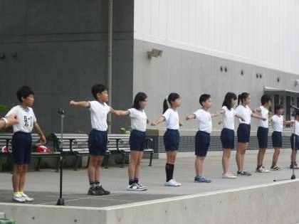 今月の体育朝会はラジオ体操を行いました。児童も多いので、運動委員が前で動きを紹介しました。3分ほどの運動ですが、正しく運動すると汗ばんできました。